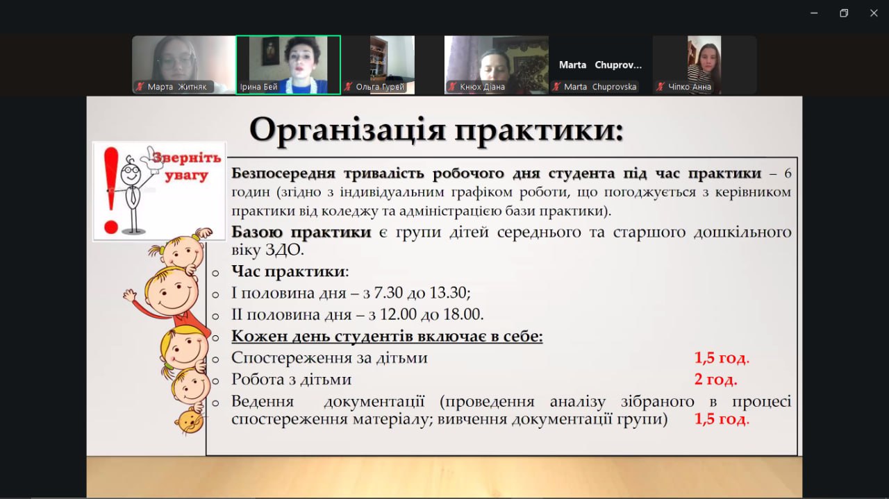 Ірина БЕЙ, керівник практики від коледжу, представила здобувачкам освіти методичні рекомендації щодо виконання змісту обумовленої практики. Вони включають мету, завдання, етапи реалізації, форми звітності та критерії оцінювання студенток, що проходитимуть практику як в офлайн, так і в дистанційному форматах.